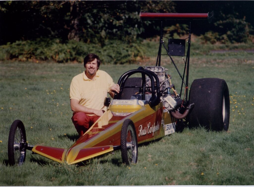 Russ also campaigned the dragster across Europe. At Mantorp Park in Sweden, competitors protested—much to the organisers’ frustration—that Russ had been placed in the wrong class because his entry weight failed to include his own not-insubstantial body weight. Reclassified into a less favourable category, Russ nevertheless defeated all Swedish competitors, losing only narrowly in the final to John Whitmore, who was running in the lower class.